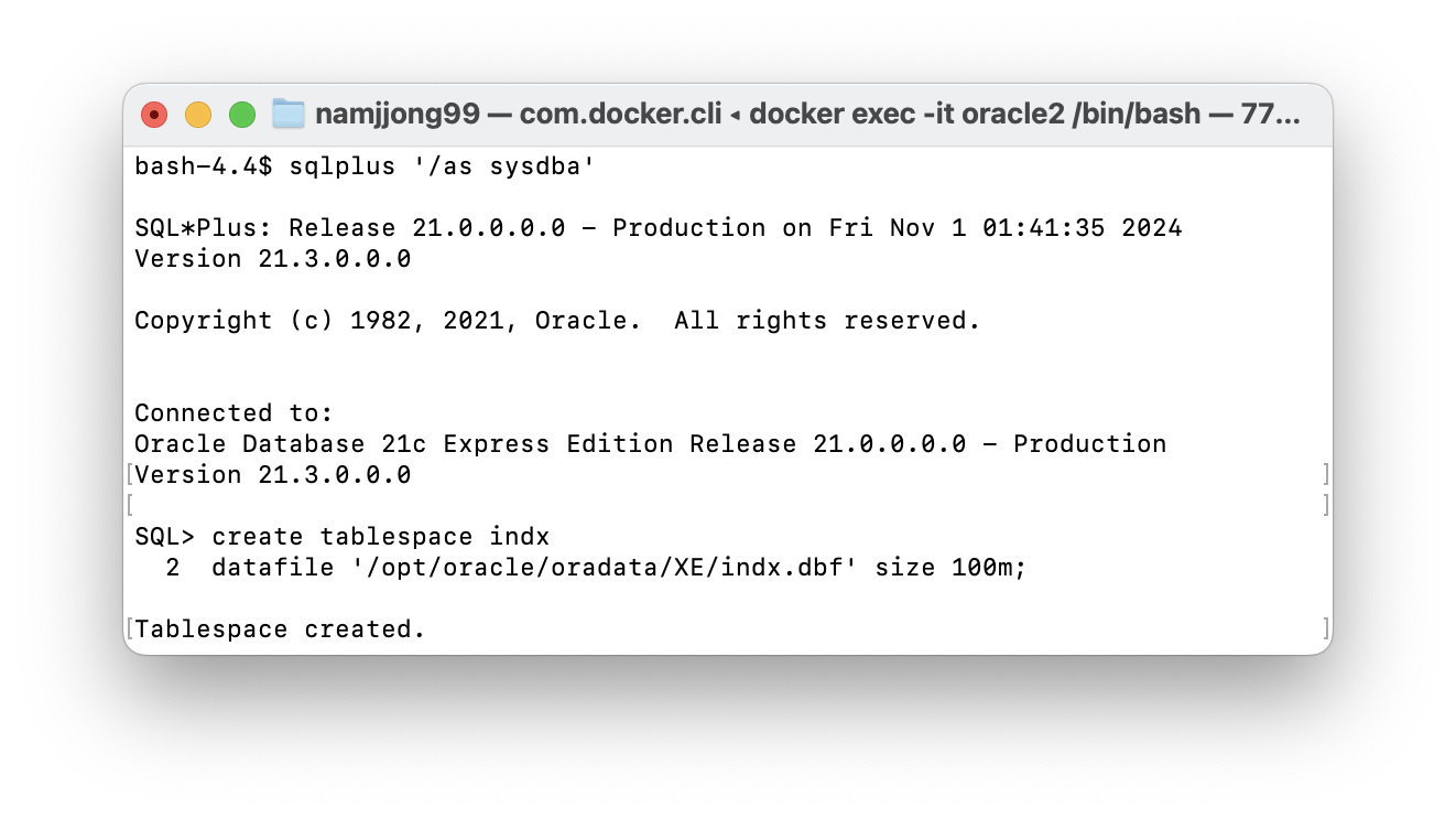 다시 SQL plus로 돌아와 조금 전 경로를 입력하면 indx라는 이름의 dbf 파일과 함께 Tablespace가 성공적으로 생성된 걸 확인할 수 있다!